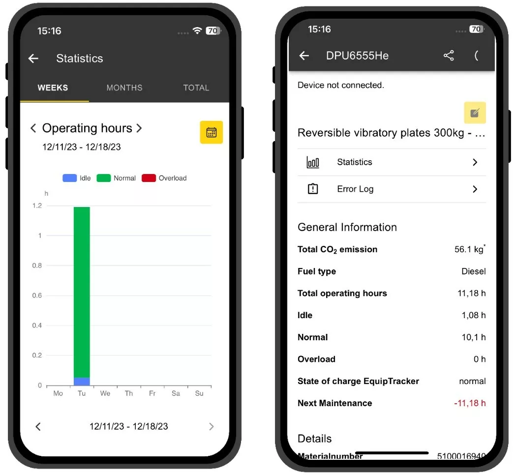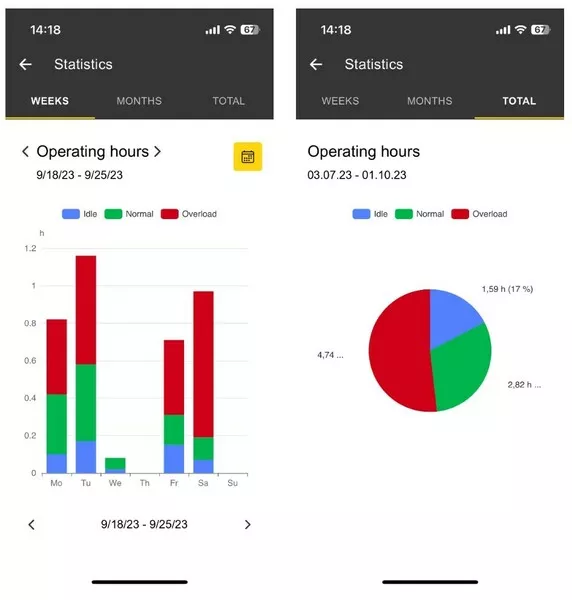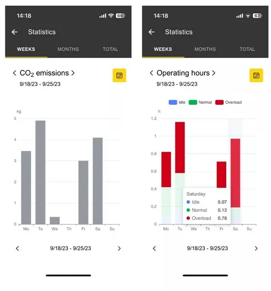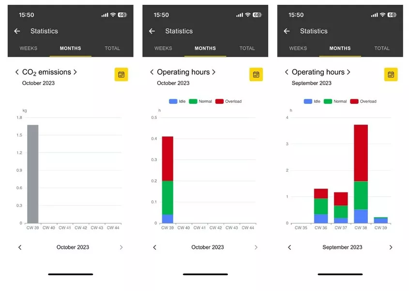 - Po zintegrowaniu EquipTrack z aplikacją i zamontowaniu go na urządzeniu, EquipTrack w sposób ciągły rejestruje dane operacyjne: godziny pracy, stany pracy (bezczynność, normalne obciążenie, przeciążenie), dane dotyczące przyspieszenia, następna konserwacja, emisje CO2, pamięć błędów (można udostępniać za pośrednictwem WhatsApp, e-maila, SMS-a itp.). Można wyświetlić statystyki zebranych danych za wybrany okres (dzień, tydzień lub miesiąc).