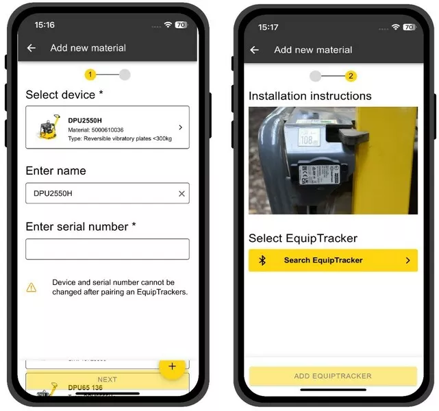 - Moduł EquipTrack i maszyna są dodawane do aplikacji EquipTrack przed pierwszym użyciem. Użytkownikowi zostaną następnie wyświetlone instrukcje instalacji dla danej maszyny,
