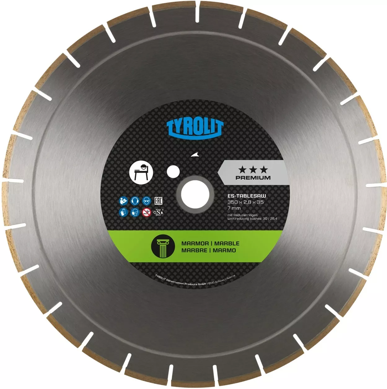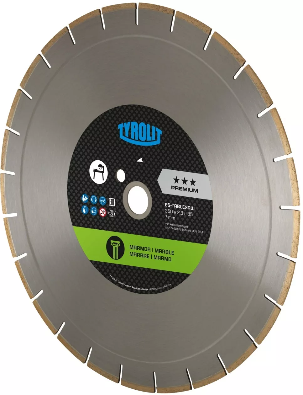 Tarcze do przecinarek stolikowych Tyrolit z seri ES-T są stosowane do materiałów takich jak : kamień miękki, np. marmur i skała wapienna. Do tarcz dostarczny jest pierścień redukcyjny 35-30 mm i 30-25,4 mm znajdujący się w zestawie.