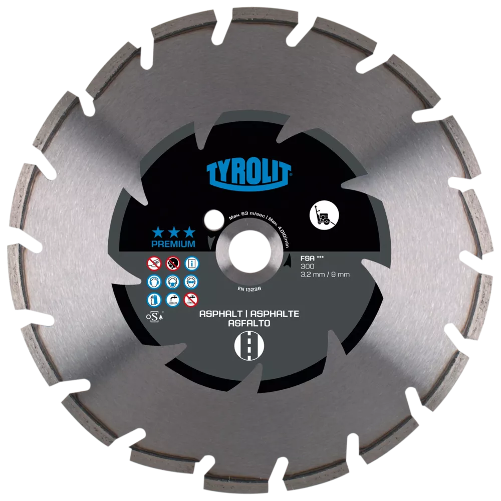 Tarcze do cięcia nawierzchni marki Tyrolit z serii FSA przeznaczone są do maszyn o mocy do 15kW. Zastosowanie od miękkich do bardzo twardych kruszyw. Przy średnicach do 600 mm segmenty spawane laserowo. Specjalny kształt segmentu zapobiega przedwczesnemu zużyciu dysku w strefie łączenia. Do tarcz o otworze 35 mm dostarczany jest pierścień redukcyjny 35-25,4 mm. Tarcza wyposażona jest w otwór pomiarowy do łatwej kontroli zużycia segmentów.