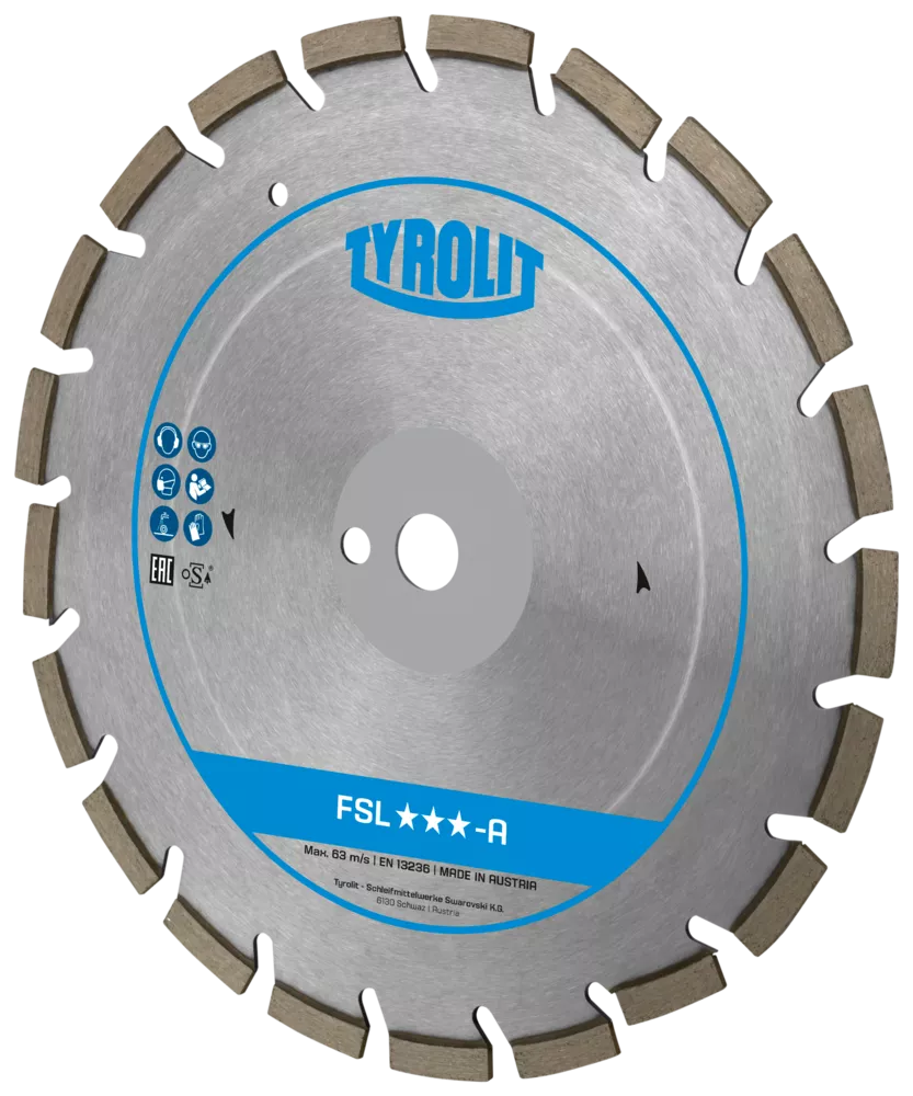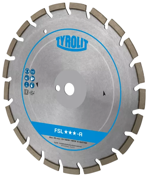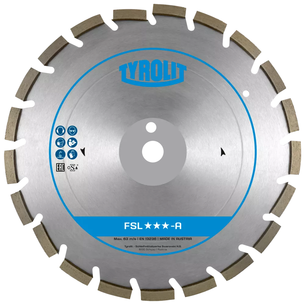 Jezdna przecinarka spalinowa Tyrolit FSG620 (600 mm), głębokość cięcia 230 mmTarcze do cięcia nawierzchni marki Tyrolit z serii FSL-A przeznaczone są do maszyn o mocy do 25kW. Zastosowanie od miękkich do twardych kruszyw. Przy średnicy do 600 mm segmenty spawane laserowo. Specjalny kształt segmentu zapobiega przedwczesnemu zużyciu dysku w strefie łączenia. Do tarcz o otworze 35 mm dostarczany jest pierścień redukcyjny 35-25,4 mm.