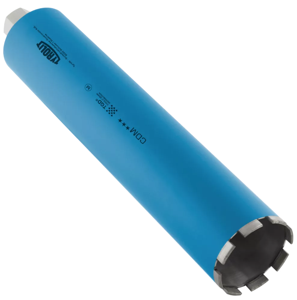 Wiertła koronowe do wiercenia na mokro z serii CDM w technologi TGD® to narzędzia o wysokiej jakości, spełniające najwyższe wymagania i charakteryzujące się najwyższą ekonomicznością. Moc wiertnicy ponad 3 kW. Stosowane do średnio twardych oraz twardych kruszyw betonowych. Znakomita stała wydajność, uniwersalne zastosowanie i łatwe usuwanie rdzenia. Segmentowane wiertła od średnicy 82 mm z technologia TGD® posiadają nową wysokość segmentu 11,3 mm. Spawane laserowo segmenty do średnicy 250 mm zapewniają najwyższe bezpieczeństwo. Narzędzia diamentowe Tyrolit produkowane z zastosowaniem technologii TGD® zapewniają wyjątkowo ekonomiczną i efektywną pracę dzięki inteligentnemu rozkładowi ziaren, tzw. TYROLIT GRAIN DISTRIBUTION.