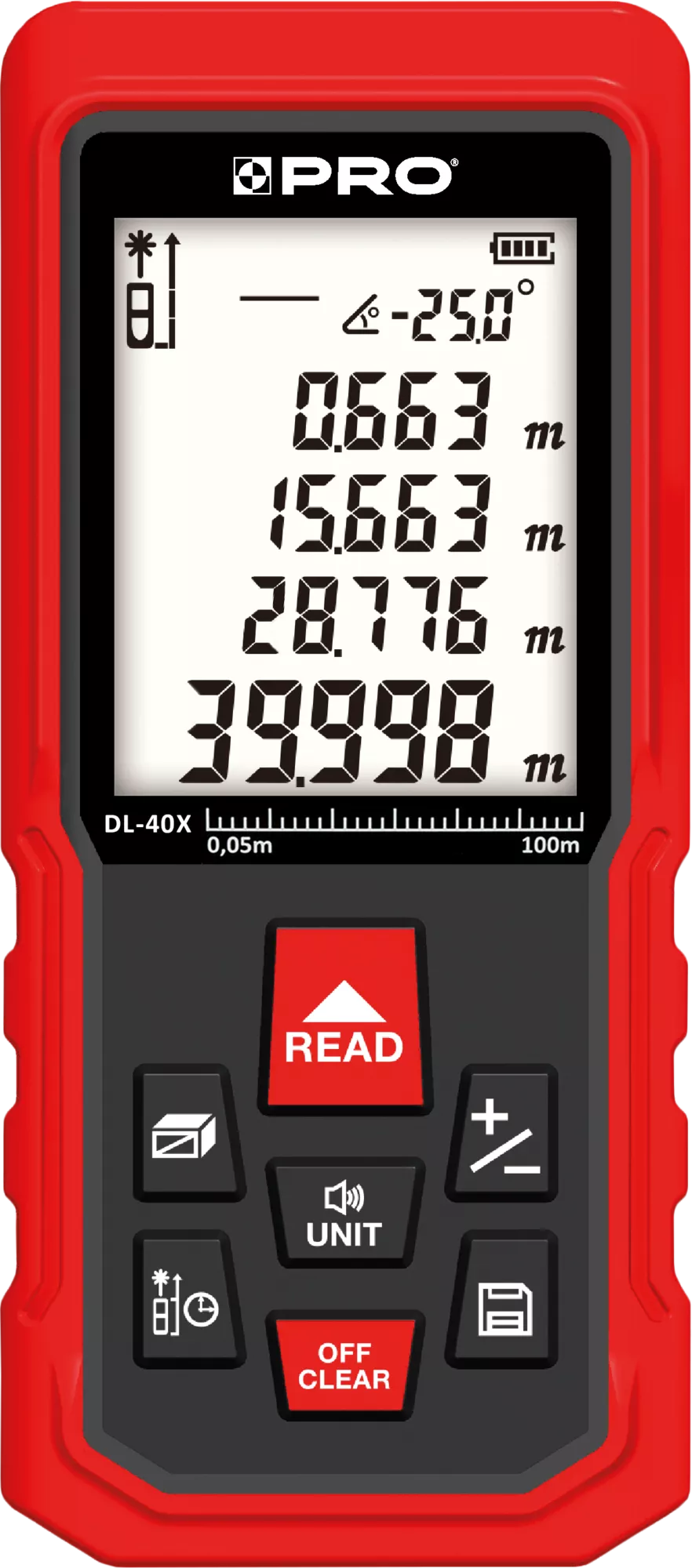 Dalmierz laserowy DL-60X marki PRO służy do pomiarów odległości powierzchni oraz kubatury wybranego obiektu. Posiada funkcje: pomiaru pośredniego (wzbogaconą o możliwość obliczania sumy i różnicy), pomiaru ciągłego i dynamicznego. Umożliwia pracę w zakresie 0,05 – 60 m, a dokładność pomiaru wynosi +/- 2 mm. Trzy punkty odniesienia pomiaru – przednia ścianka, tylna ścianka urządzenia oraz gniazdo ¼ cala. Dalmierz wyposażony jest we wbudowany kątomierz cyfrowy. Jednostki miary które możemy wybrać to metry, stopy, cale. Rozbudowana pamięć umożliwia zapisywania pomiarów (do 99) oraz wykonywanie na nich działań dodawania oraz odejmowania.