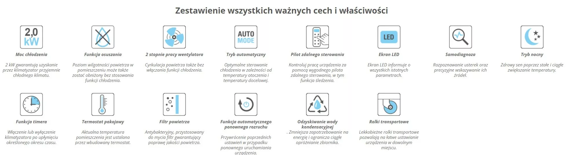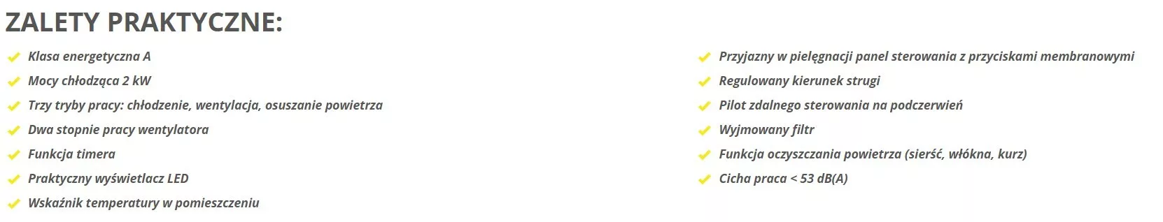 - Klasa wydajności energetycznej A zapewnia pełną kontrolę nad kosztami eksploatacji – urządzenie jest wyposażone w system ponownego wykorzystania skroplonej wody oraz funkcję sterowania czasem włączania i wyłączania. Zapewnia to maksymalną redukcję zużycia energii i niskie koszty chłodzenia,