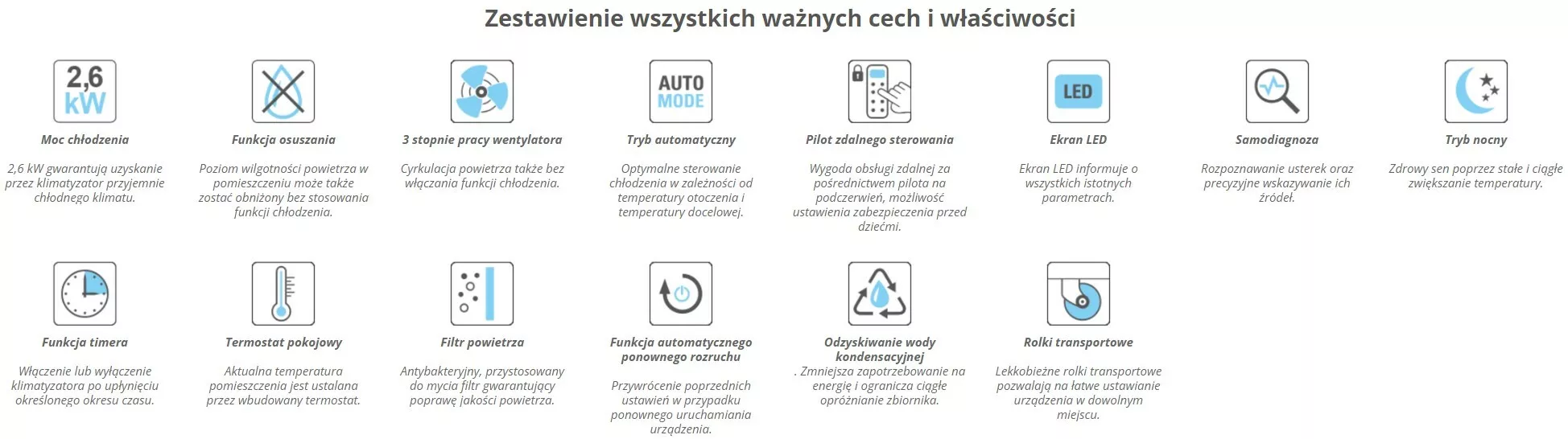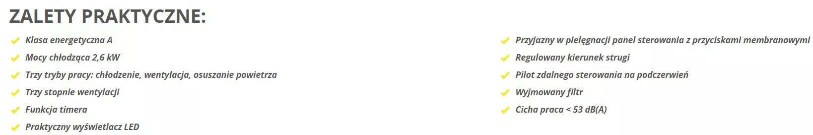 - W okresie intensywnych upałów i wysokiej wilgotności powietrza, skuteczność osuszania sięgająca do 1,4 litra na godzinę skutecznie wspomaga wytworzenie komfortowego klimatu wewnątrz pomieszczenia,