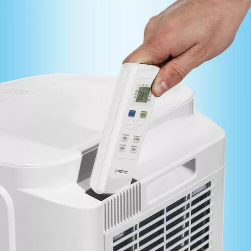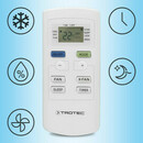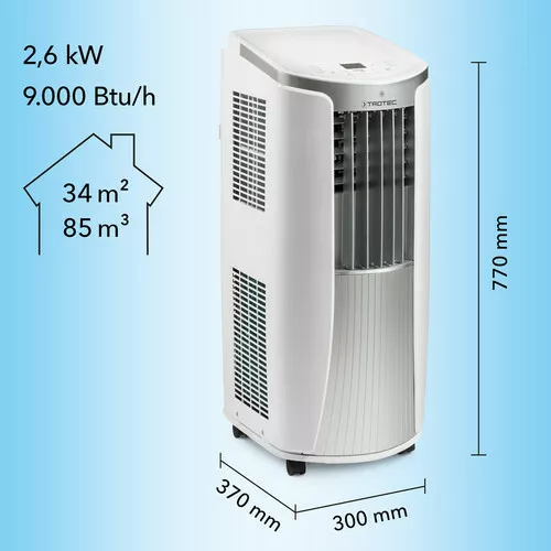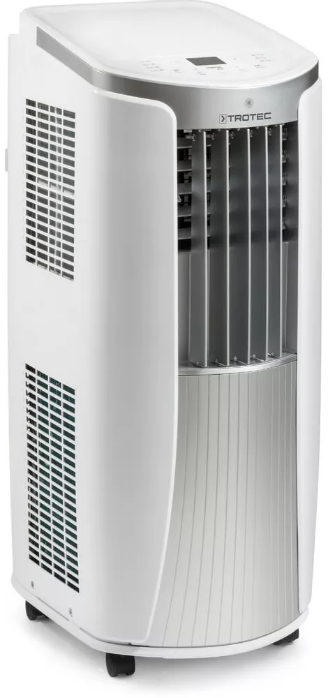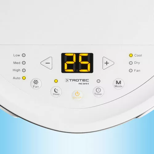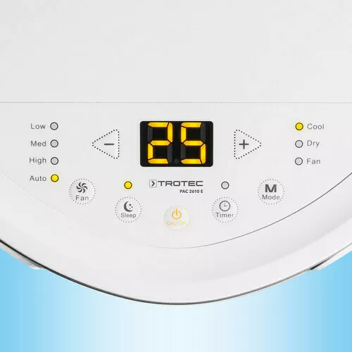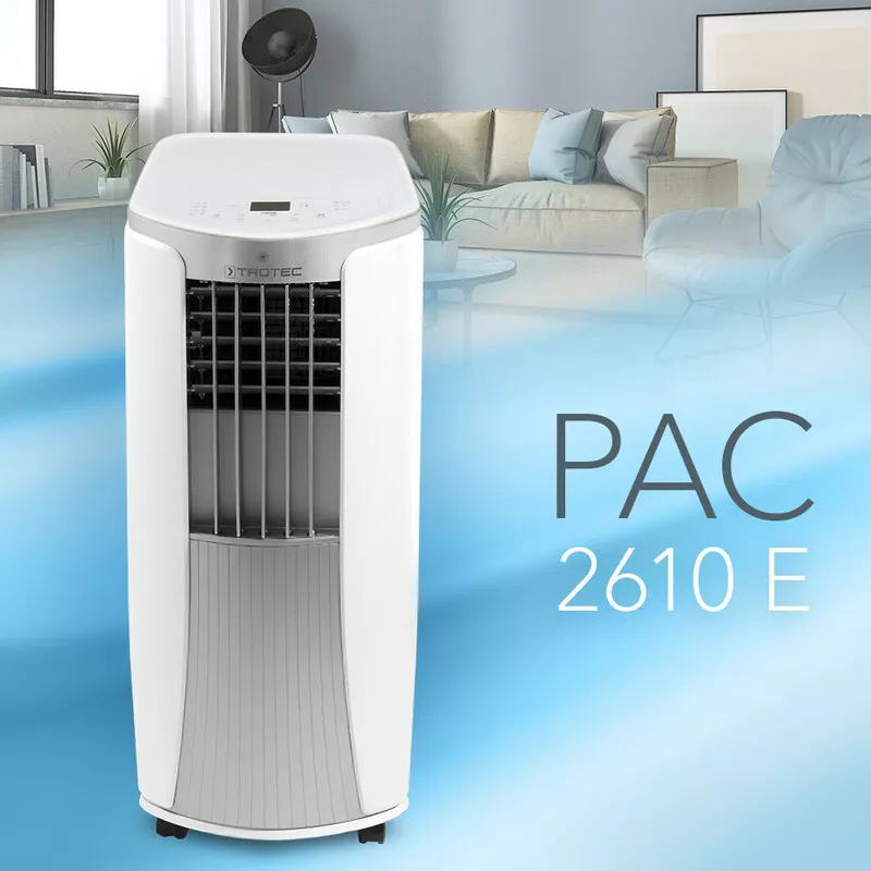 3-funkcyjny klimatyzator przenośny PAC 2610 E marki Trotec gwarantuje przyjemną atmosferę wnętrza poprzez chłodzenie, wentylację i osuszanie powietrza. Jest on idealnym urządzeniem do chłodzenia pomieszczeń o powierzchni do 85 m³. Odpowiedni tryb pracy, temperatura pomieszczenia, trzy stopnie wentylacji oraz automatyczna dmuchawa klimatyzatora mogą zostać uruchomione za pośrednictwem wyróżniającego się dużym zasięgiem pilota zdalnego sterowania na podczerwień lub bezpośrednio za pomocą komfortowego panelu sterowania wyposażonego w przyciski membranowe.