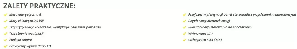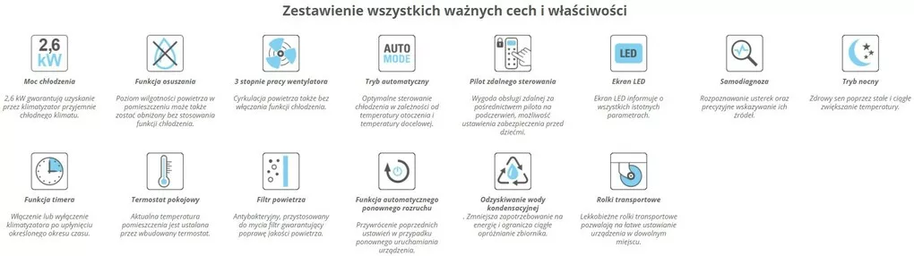- Zużycie energii przez klimatyzator to ważny czynnik. Klasa wydajności energetycznej A zapewnia pełną kontrolę nad kosztami eksploatacji. Samo urządzenie jest wyposażone w system ponownego wykorzystania skroplonej wody oraz funkcję sterowania czasem włączania i wyłączania. Zapewnia to maksymalną redukcję zużycia energii i niskie koszty chłodzenia.
