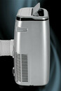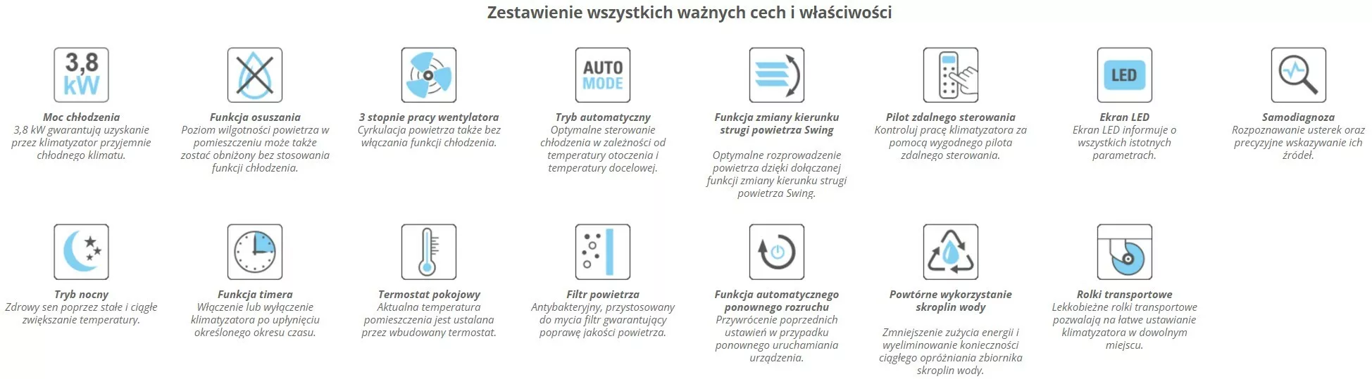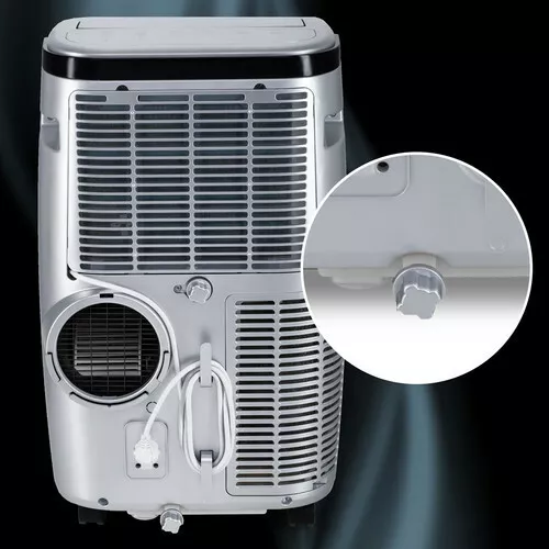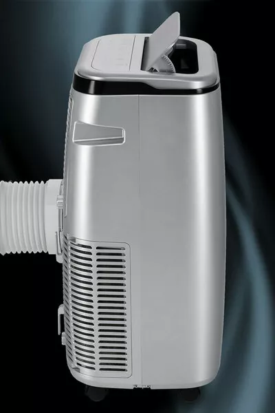 - Urządzenie wyposażone jest w łatwobieżne rolki transportowe oraz duże, wpuszczane uchwyty. Pozwala to na szybkie i łatwe transportowanie klimatyzatora z jednego pomieszczenia do drugiego bez konieczności podnoszenia. Znajdujące się z tyłu mocowanie przewodu zabezpiecza przed potknięciem,