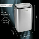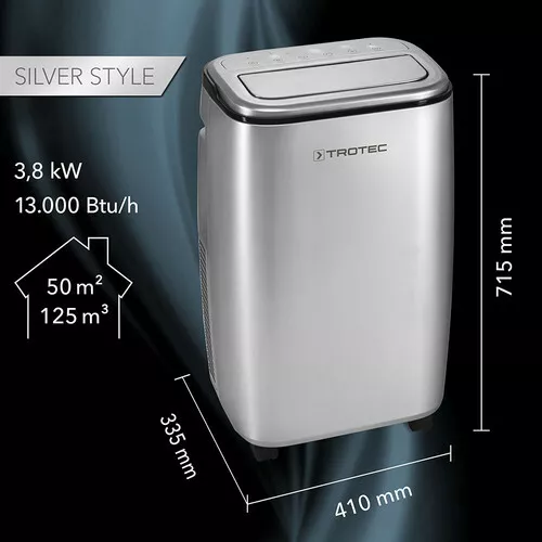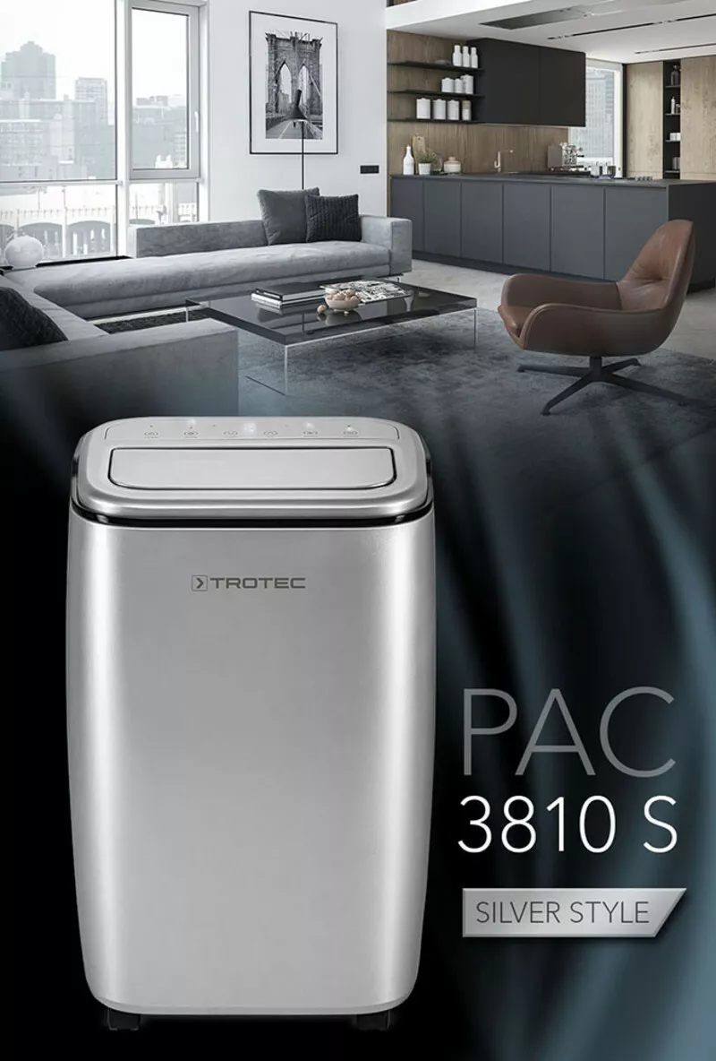 Klimatyzator przenośny PAC 3810 S marki Trotec łączy w sobie atrakcyjny wygląd i funkcjonalność - chłodzenie, wentylację i osuszanie powietrza, które mogą być używane niezależnie od siebie. Zarówno w przypadku pomieszczeń domowych, firmowych, hotelowych, jak i sal treningowych, srebrna obudowa i moc chłodzenia wynosząca 3,8 kW czyni ekskluzywny klimatyzator idealnym urządzeniem do dużych pomieszczeń o wielkości do 50 m².