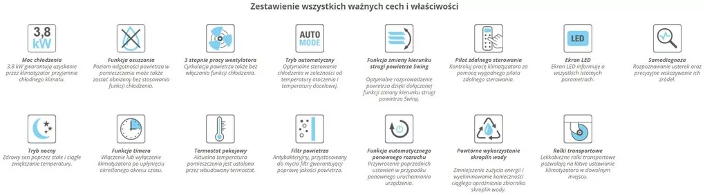 - Zużycie energii przez klimatyzator to ważny czynnik. Klasa wydajności energetycznej A zapewnia pełną kontrolę nad kosztami eksploatacji. Samo urządzenie jest wyposażone w system ponownego wykorzystania skroplonej wody oraz funkcję termostatycznego sterowania włączania i wyłączania. Zapewnia to maksymalną redukcję zużycia energii i niskie koszty chłodzenia,