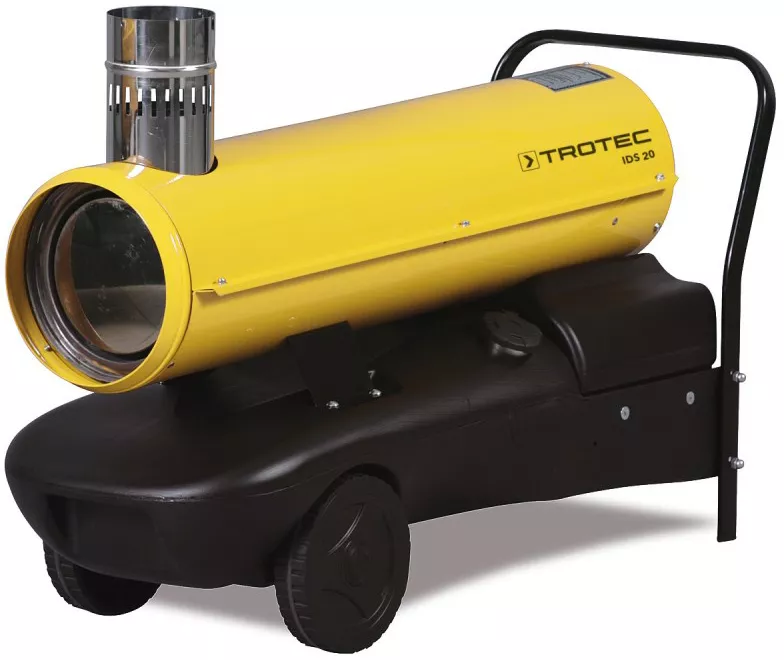 Ta olejowa dmuchawa grzewcza profesjonalnej serii IDS marki Trotec cechuje się bardzo korzystnym stosunkiem parametrów do ceny. Urządzenie zapewnia szybkie nagrzewanie warsztatów, obór, pomieszczeń magazynowych, budów lub szklarni. Ze względu na zastosowanie podwozia oraz dużych kół, urządzenie może zostać łatwo i szybko przetransportowane w inne miejsce pracy. Uniwersalność urządzenia jest dodatkowo zwiększona przez zastosowanie zintegrowanego zbiornika, co wyeliminowało konieczność zapewnienia zewnętrznego źródła paliwa. Produkowany na terenie Europy model IDS 20 jest niezwykle wytrzymały. Do seryjnego wyposażenia należy elektroniczny nadzór płomienia, termostat bezpieczeństwa oraz zabezpieczenie przed przegrzaniem i w pełni automatyczne chłodzenie po wyłączeniu. Dzięki zastosowaniu dwuściennej, pokrytej ochronnym lakierem obudowy, urządzenie gwarantuje zwiększone bezpieczeństwo pracy. Niska temperatura powierzchni zewnętrznej zmniejsza ryzyko wypadków oraz zmniejsza poziom hałasu emitowanego w trakcie pracy. Szybkie nagrzewanie możliwe jest dzięki zastosowaniu zintegrowanego, wysokiej jakości palnika olejowego i pompy Danfoss®. Przy wydajności 550 m³/godz. model IDS 20 uzyskuje nominalną moc wynoszącą 23,4 kW. Zastosowanie wyposażenia dodatkowego umożliwia całkowicie automatyczną pracę z zastosowaniem zewnętrznego termostatu z przewodem o długości 10 metrów.