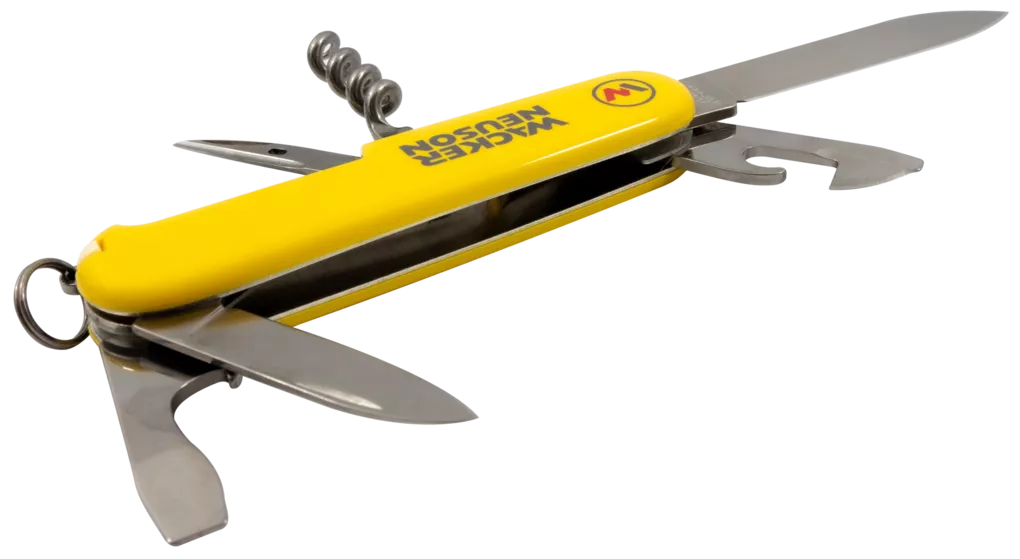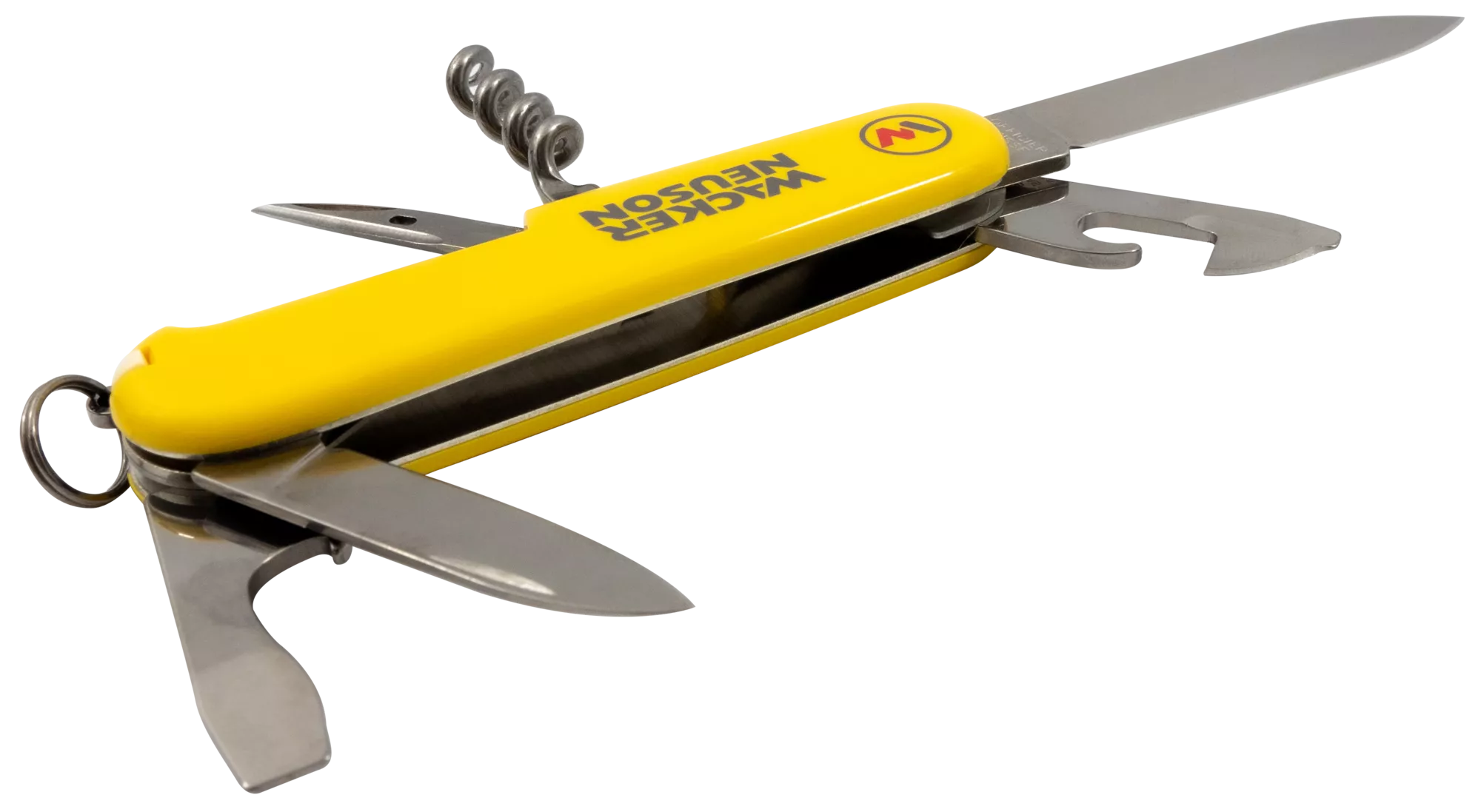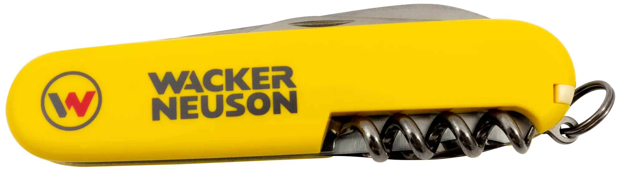 - Na obudowie scyzoryka zostało nadrukowane logo marki Wacker Neuson, wiodącego na świecie producenta maszyn i sprzętu budowlanego oraz logo firmy Victorinox,