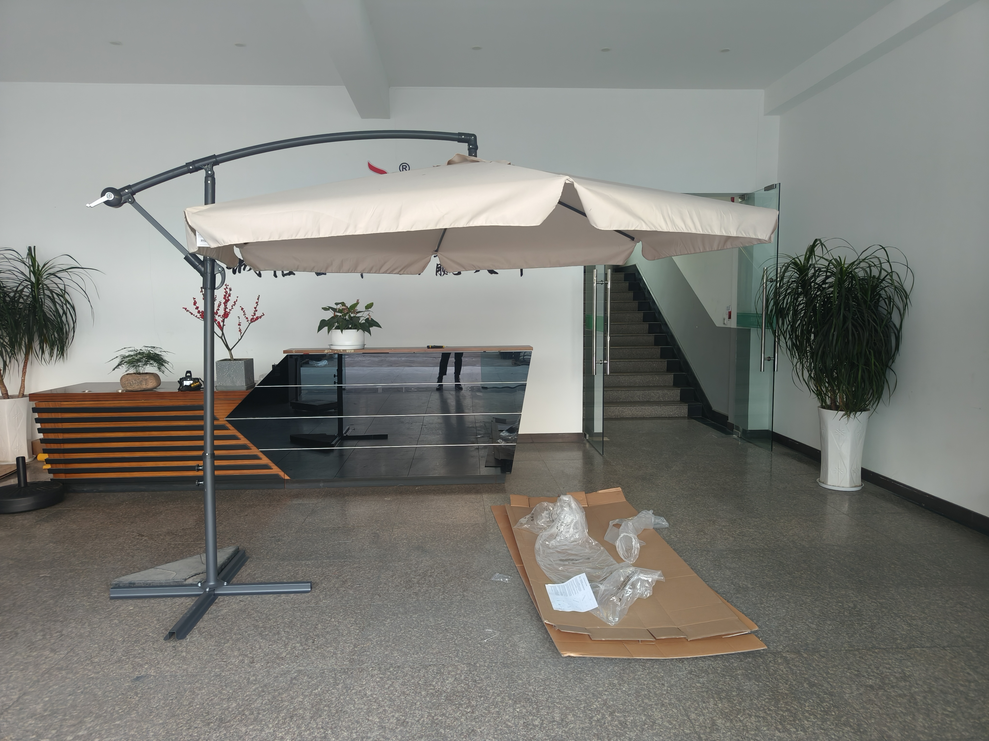 - Łatwość montażu i demontażu - prosty system złączenia elementów umożliwia szybkie rozłożenie i złożenie parasola, co jest praktyczne przy zmiennej pogodzie i ułatwia przechowywanie,