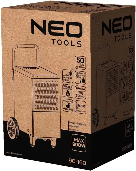 Osuszacz budowlany 90-160 marki Neo Tools służy do osuszania powietrza oraz pozbywania się wilgoci z pomieszczeń. Z jego pomocą możliwe jest przyspieszenie prac budowlanych i remontowych oraz likwidowanie skutków nieszczelnego dachu czy powodzi. Urządzenie to umożliwia programowanie czasu działań na wyświetlaczu LCD, a także wyposażone jest w funkcję automatycznego odszraniania i opcję ciągłego drenażu.