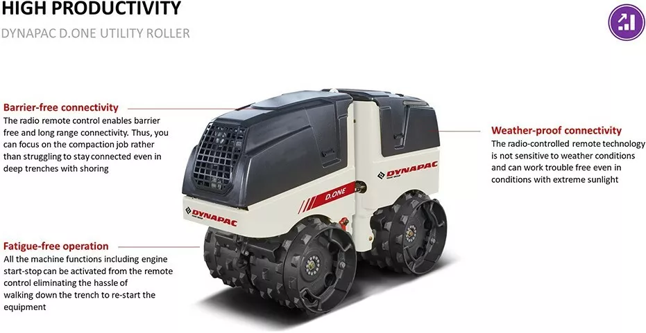 Walec okołkowany D.ONE marki Dynapac łączy wydajność z ekonomią i bezpieczeństwem pracy. Ergonomiczny design zapewnia pewność działania i minimalizuje przestoje, obniżając koszty eksploatacji. Zapewnia też wysoką jakość zagęszczania przy niższej emisji CO₂ i hałasu, co sprzyja zrównoważonemu rozwojowi. Funkcja zdalnego sterowania dodatkowo zwiększa bezpieczeństwo i komfort użytkowania. Dodatkowo urządzenie zostało wyposażone w miernik zagęszczenia.