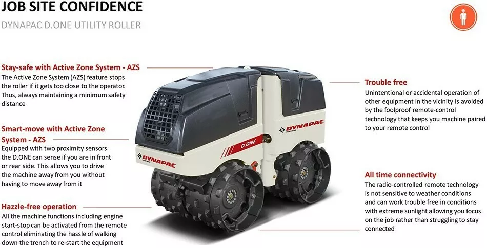 - Pozostań bezpieczny z Systemem Aktywnej Strefy AZS - funkcja Systemu Aktywnej Strefy (AZS) zatrzymuje walec, jeśli zbliży się on zbyt blisko do operatora. Dzięki temu zawsze zachowana jest minimalna bezpieczna odległość.