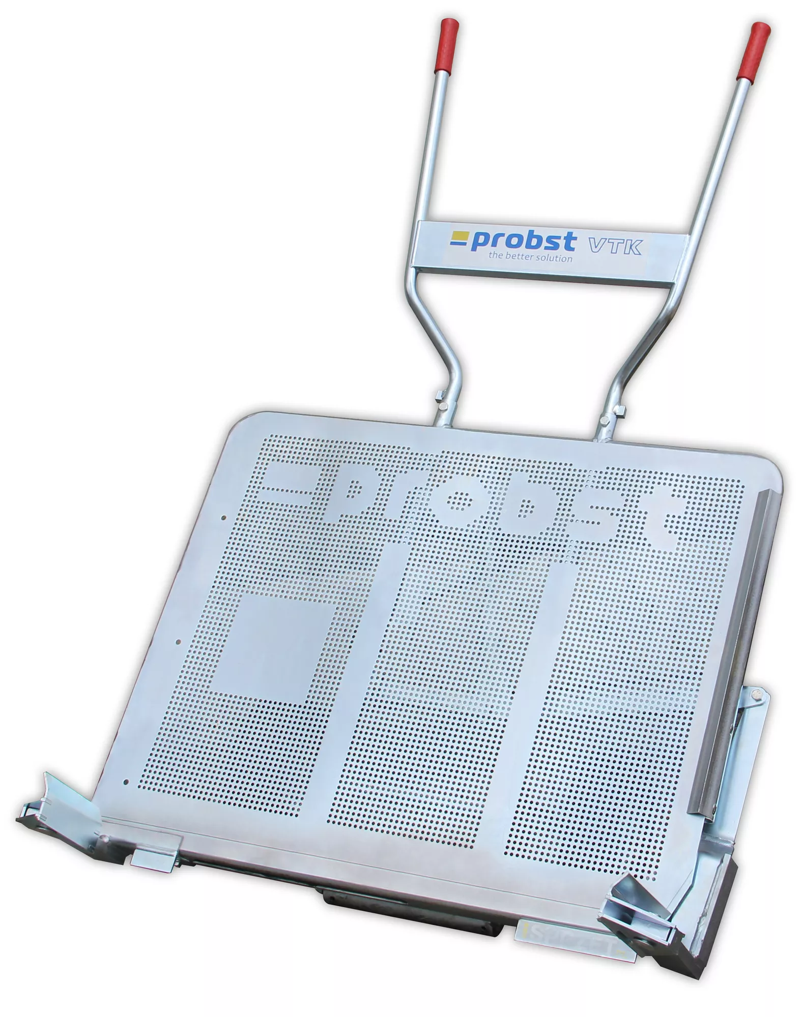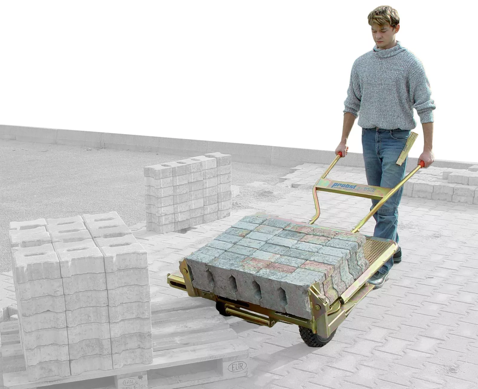 Ręczny transport kostki może być wyjątkowo szybki i łatwy dzięki regulowanemu wózkowi brukarskiemu VTK-V marki Probst z kołem wspomagającym VTK-V-SR/N, przeznaczonemu do przewożenia całych warstw kostki z palety w miejsce pracy. Transport kostki zajmuje prawie 70% czasu pracy. W porównaniu do tradycyjnego przenoszenia kostki ręcznie lub taczkami, zakup wózka VTK-V zwraca się wyjątkowo szybko. Wózki brukarskie VTK-V łączą w sobie wiele innowacji znacznie usprawniających pracę. Praca może zostać wykonana szybciej, prościej i wydajniej. Zarówno pracownik jak i przewożone materiały są całkowicie bezpieczne. Wózek może zostać wyposażony w trzecie, kółko podporowe, co pozwala dodatkowo odciążyć osobę pchającą wózek. Dowiedziono, iż zastosowanie wózka VTK-V znacząco redukuje obciążenie fizyczne pracownika i usprawnia cały proces układania kostki brukowej. Zamontowanie dodatkowej, szerokiej półki umożliwia przewożenie niewielkich maszyn i narzędzi.
